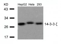 Western Blot: extracts from HepG2, HeLa and 293 cells stained with anti-14-3-3 zeta antibody ARG51169.