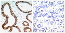 Immunohistochemistry: paraffin-embedded human breast carcinoma tissue stained with anti-14-3-3 zeta antibody ARG51169 (left) or the same antibody preincubated with blocking peptide (right).
