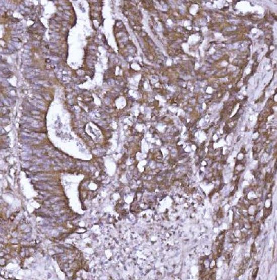 Immunohistochemistry: Human colorectal adenocarcinoma stained with ARG45442 anti-ABP1 antibody at 2 μg/ml dilution.