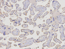 Immunohistochemistry: Paraffin-embedded Human placenta tissue. Antigen Retrieval: Heat mediation was performed in Citrate buffer (pH 6.0) for 20 min. The tissue section was blocked with 10% goat serum. The tissue section was then stained with ARG42695 anti-ACKR2 antibody at 1 µg/ml dilution, overnight at 4°C.