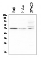 Western blot: 50 µg of samples under reducing condition. Raji, HeLa and SW620 whole cell lysates stained with ARG42695 anti-ACKR2 antibody at 0.5 µg/ml dilution, overnight at 4°C.