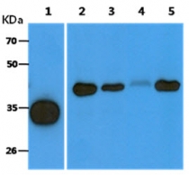 Western blot: 1) 10 ng of Recombinant Human ACOT8, 40 µg of 2) Ramos cell lysate, 3) A431 cell lysate, 4) 293T cell lysate, 5) A549 cell lysate stained with ARG57045 anti-ACOT8 antibody [4D10] at 1:1000.
