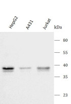 Western blot: HepG2, A431 and Jurkat stained with ARG44151 anti-ACP5 / TRAcP antibody at 0.5 μg/mL dilution.
