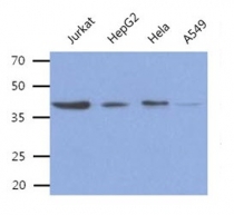 Western blot: 40 µg of Jurkat, HepG2, HeLa, and A549 stained with ARG57036 anti-ACY1 / Aminoacylase 1 antibody [1E2] at 1:500.