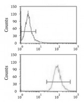 Flow Cytometry: HepG2 cells stained with ARG55246 anti-ADH1B antibody (bottom histogram) or without primary antibody control (top histogram), followed by incubation with FITC labelled secondary antibody.