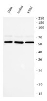 Western blot: Hela, Jurkat, and K562 stained with ARG45147 anti-AEBP2 antibody at 0.5 μg/ml dilution.
