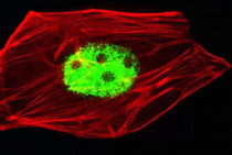 Immunofluorescence: HeLa cells stained with ARG55149 anti-AGAP4 antibody (green) at 1:25 dilution. Cytoplasmic actin was counterstained with Alexa Fluor® 555 conjugated with Phalloidin (red).