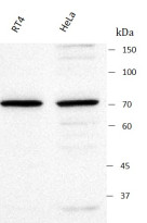 Western blot: RT4 and HeLa stained with ARG44336 anti-AIRE antibody at 0.5 μg/ml dilution.