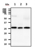Western blot: 40 µg of 1) Hep3B cell lysate, 2) 293T cell lysate, 3) Mouse kidney tissue lysate stained with ARG56921 anti-AK3 antibody [SJB3-36] at 1:1000.