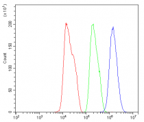 Flow Cytometry: HepG2 cells were blocked with 10% normal goat serum and then stained with ARG42972 anti-AKR1D1 antibody [6I4] (blue) at 1 µg/10^6 cells for 30 min at 20°C, followed by incubation with DyLight®488 labelled secondary antibody. Isotype control antibody (green) was Mouse IgG (1 µg/10^6 cells) used under the same conditions. Unlabelled sample (red) was also used as a control.