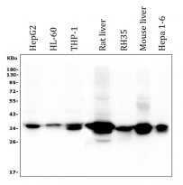 Western blot: 50 µg of sample under reducing conditions. HepG2, HL-60, THP-1, Rat liver, RH35, Mouse liver and Hepa 1-6 whole cell lysates stained with ARG42972 anti-AKR1D1 antibody [6I4] at 0.5 µg/ml dilution, overnight at 4°C.