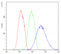 Flow Cytometry: HepG2 cells were blocked with 10% normal goat serum and then stained with ARG42960 anti-AKR1D1 antibody (blue) at 1 µg/10^6 cells for 30 min at 20°C, followed by incubation with DyLight®488 labelled secondary antibody. Isotype control antibody (green) was Rabbit IgG (1 µg/10^6 cells) used under the same conditions. Unlabelled sample (red) was also used as a control.