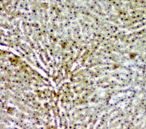 Immunohistochemistry: Paraffin-embedded Rat liver tissue. Antigen Retrieval: Heat mediation was performed in Citrate buffer (pH 6.0) for 20 min. The tissue section was blocked with 10% goat serum. The tissue section was then stained with ARG42960 anti-AKR1D1 antibody at 1 µg/ml dilution, overnight at 4°C.