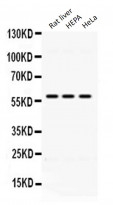 Western blot: Rat liver extract, HEPA whole cell lysates and HeLa whole cell lysates stained with ARG58306 anti-ALDH7A1 antibody at 0.5 µg/ml dilution.