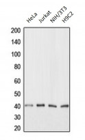 Western blot: HeLa, Jurkat, NIH/3T3 and H9C2 whole cell lysates stained with ARG66456 anti-ANKRD1 antibody.