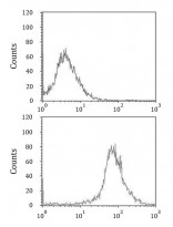 Flow Cytometry: HepG2 cells stained with ARG54814 anti-APRT antibody (bottom histogram) or without primary antibody control (top histogram), followed by incubation with FITC labelled secondary antibody.