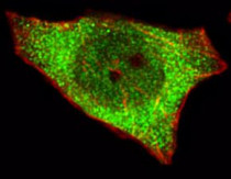 Immunofluorescence: A549 cells were fixed with 4% PFA (20 min), permeabilized with Triton X-100 (0.1%, 10 min), then stained with ARG54814 anti-APRT antibody (green) at 1:25 dilution, 1 h at 37°C. Cytoplasmic actin was counterstained with Alexa Fluor® 555 (red) conjugated Phalloidin (7 units/ml, 1 h at 37°C).