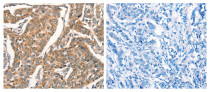Immunohistochemistry: Paraffin-embedded Human breast cancer tissue stained with ARG42856 anti-ARFRP1 antibody (left) at 1:25 dilution, or the same antibody pre-incubated with synthetic peptide (right). (Original magnification: X200).