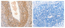 Immunohistochemistry: Paraffin-embedded Human cervical cancer tissue stained with ARG42856 anti-ARFRP1 antibody (left) at 1:25 dilution, or the same antibody pre-incubated with synthetic peptide (right). (Original magnification: X200).