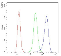 Flow Cytometry: A431 cells were blocked with 10% normal goat serum and then stained with ARG59029 anti-ARHGEF1 antibody (blue) at 1 µg/10^6 cells for 30 min at 20°C, followed by incubation with DyLight®488 labelled secondary antibody. Isotype control antibody (green) was rabbit IgG (1 µg/10^6 cells) used under the same conditions. Unlabelled sample (red) was also used as a control.