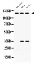 Western blot: Rat brain, HeLa and Jurkat lysates stained with ARG59029 anti-ARHGEF1 antibody at 0.5 µg/ml dilution.
