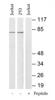 Western blot: Jurkat and 293 cell lysates stained with ARG66604 anti-ARNT2 antibody. The lane on the right was blocked with the synthetic peptide.
