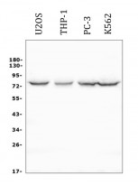 Western blot: 50 µg of samples under reducing conditions. U2OS, THP-1, PC-3 and K562 whole cell lysates stained with ARG41358 anti-ARNTL / BMAL1 antibody at 0.5 µg/ml dilution, overnight at 4°C.