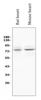 Western blot: 50 µg of samples under reducing conditions. Rat heart and Mouse heart lysates stained with ARG41358 anti-ARNTL / BMAL1 antibody at 0.5 µg/ml dilution, overnight at 4°C.