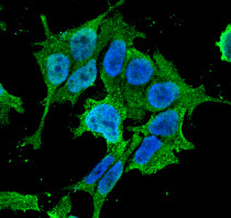 Immunofluorescence: Human Neuroblastoma cell line SK-N-BE. Fixation: 4% Formaldehyde for 15 min at RT. Primary Antibody: ARG22245 anti-ASIC1 antibody [S271-44] at 1:100 for 60 min at RT. Secondary Antibody: Goat anti-Mouse ATTO 488 at 1:100 for 60 min at RT. DAPI (blue) nuclear stain.