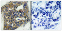 Immunohistochemistry: Paraffin-embedded Human breast carcinoma tissue stained with ARG51675 anti-ASK1 phospho (Ser966) antibody (left) or the same antibody preincubated with blocking peptide (right).