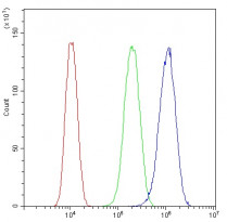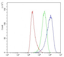 Flow Cytometry: HeLa cells were blocked with 10% normal goat serum and then stained with ARG58312 anti-ASPH / Aspartate beta hydroxylase antibody (blue) at 1 µg/10^6 cells for 30 min at 20°C, followed by incubation with DyLight®488 labelled secondary antibody. Isotype control antibody (green) was rabbit IgG (1 µg/10^6 cells) used under the same conditions. Unlabelled sample (red) was also used as a control.