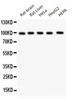 Western blot: 50 µg of Rat brain, 50 µg of Rat Liver, 40 µg of HeLa whole cell lysate, 40 µg of HepG2 whole cell lysate and 40 µg of HEPA whole cell lysate stained with ARG58312 anti-ASPH / Aspartate beta hydroxylase antibody at 0.5 µg/ml dilution.