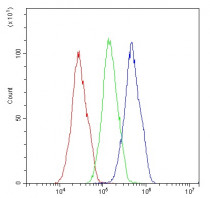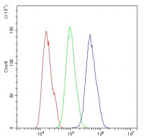 Flow Cytometry: HepG2 cells were blocked with 10% normal goat serum and then stained with ARG59431 anti-ASXL1 antibody (blue) at 1 µg/10^6 cells for 30 min at 20°C, followed by incubation with DyLight®488 labelled secondary antibody. Isotype control antibody (green) was rabbit IgG (1 µg/10^6 cells) used under the same conditions. Unlabelled sample (red) was also used as a control.