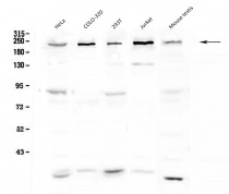 Western blot: 50 µg of samples under reducing conditions. HeLa, COLO-320, 293T, Jurkat and Mouse testis lysates stained with ARG59431 anti-ASXL1 antibody at 0.5 µg/ml, overnight at 4°C.