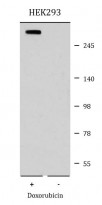 Western blot: HEK293 cells untreated (right) or treated with Doxorubicin (left). Cell lysates were stained with ARG42617 anti-ATM phospho (Ser1981) antibody.