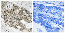 Immunohistochemistry: Paraffin-embedded Human colon carcinoma tissue stained with ARG66863 anti-ATR antibody. The picture on the right is blocked with the synthetic peptide.