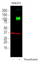 Western blot: Non-transfected HEK293 cells and HEK293 cells transfected with an expression construct containing a Myc-DDK tagged full length Human Adenylate cyclase 3 cDNA. The blots were stained with ARG52217 anti-Adenylate cyclase 3 antibody (green) at 1:2000 dilution.