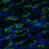 Immunohistochemistry: Rat kidney tissue stained with ARG22362 anti-Aquaporin 3 antibody (green) at 1:200 dilution. DAPI merge.