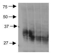 Western blot: Rat kidney inner medullary homogenates stained with ARG22362 anti-Aquaporin 3 antibody at 1:2000 dilution.