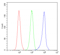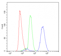 Flow Cytometry: U937 cells were blocked with 10% normal Goat serum and then stained with ARG41570 anti-Aryl Hydrocarbon Receptor antibody (blue) at 1 µg/10^6 cells for 30 min at 20°C, followed by incubation with DyLight®488 labelled secondary antibody. Isotype control antibody (green) was Rabbit IgG (1 µg/10^6 cells) used under the same conditions. Unlabelled sample (red) was also used as a control.