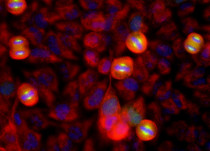Immunofluorescence: HeLa cells stained with ARG11120 anti-Aurora A antibody [1A11] (green), and co-stained with anti-Vimentin antibody (red). DAPI (blue) for nuclear staining.