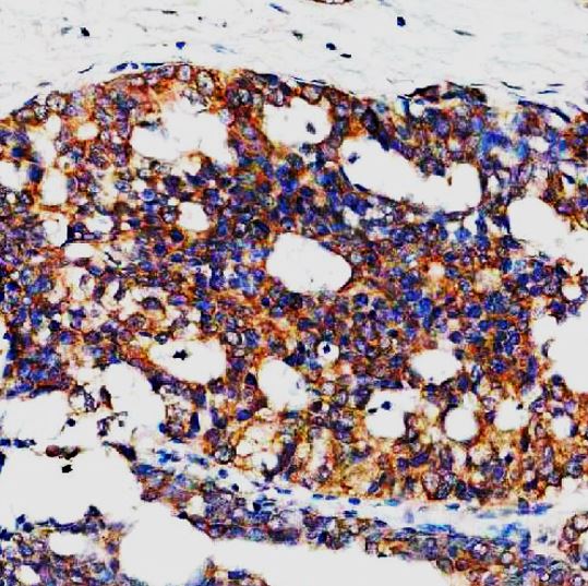 Immunohistochemistry: Human breast cancer stained with ARG45555 anti-B7H6 antibody at 2 μg/ml dilution.