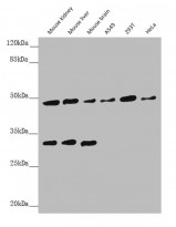 Western blot: Mouse kidney, Mouse liver, Mouse brain, A549, 293T and HeLa whole cell lysates stained with ARG58373 anti-BCS1L antibody at 5 µg/ml dilution.