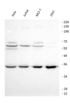 Western blot: Hela, Jurkat, MCF-7, and 293T stained with ARG45129 anti-Bag1 antibody at 0.5 μg/ml dilution.