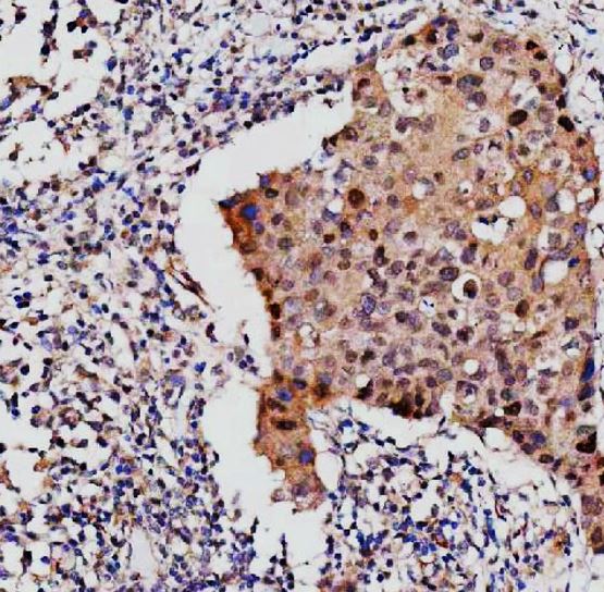 Immunohistochemistry: Human breast cancer stained with ARG45129 anti-Bag1 antibody at 2 μg/ml dilution.