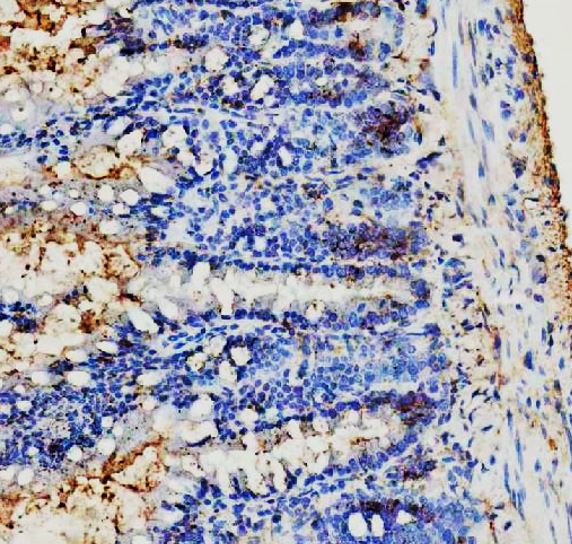 Immunohistochemistry: Mouse colon stained with ARG45129 anti-Bag1 antibody at 2 μg/ml dilution.