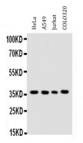 Western blot: 40 µg of HeLa, A549, Jurkat and COLO320 whole cell lysates stained with ARG40562 anti-Bub3 antibody at 0.5 µg/ml dilution.