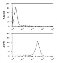 Flow Cytometry: 293 cells stained with ARG54835 anti-CBS antibody (bottom histogram) or without primary antibody control (top histogram), followed by incubation with FITC labelled secondary antibody.