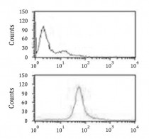 Flow Cytometry: Ramos cells stained with ARG54836 anti-CBS antibody (bottom histogram) or without primary antibody control (top histogram), followed by incubation with FITC labelled secondary antibody.