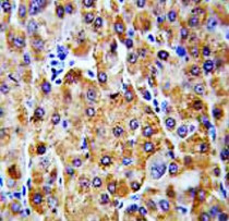 Immunohistochemistry: Formalin-fixed and paraffin-embedded Human hepatocarcinoma stained with ARG54836 anti-CBS antibody.